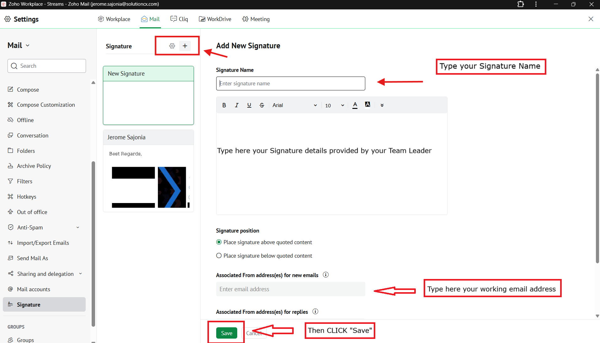 - Click the + icon to create a new signature and type all the details on your Signature.
